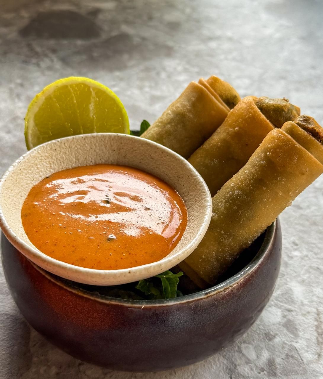 Raviolis crujientes de cerdo y verduras con salsa de leche de coco y sriracha, soja sweet chili y aceite al nuevo estilo