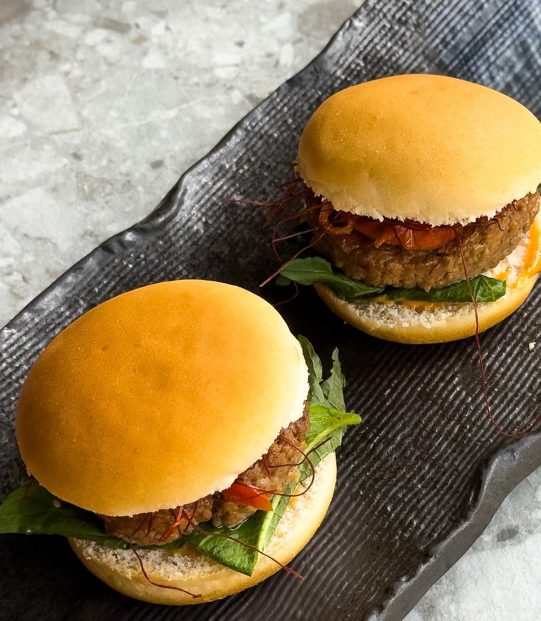 Focaccia crujiente, katsu de ternera, mayonesa de romero, salsa teriyaki, col marinada, espinacas. 2 unidades