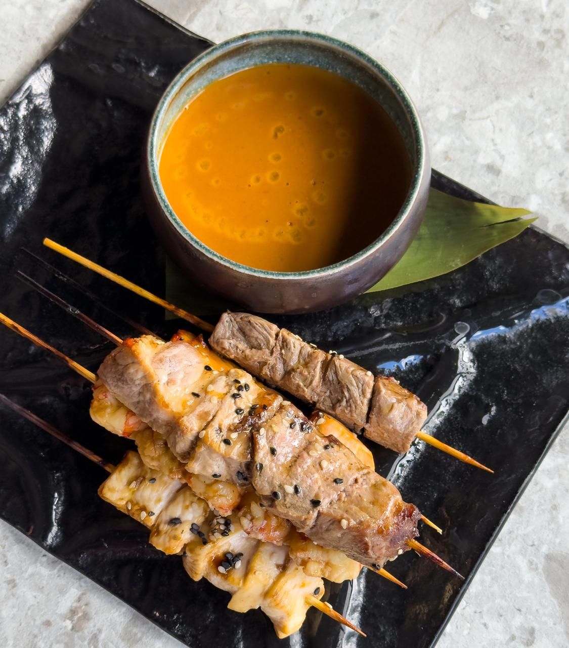 Spiedini misti di pollo, salmone, gamberi e maiale