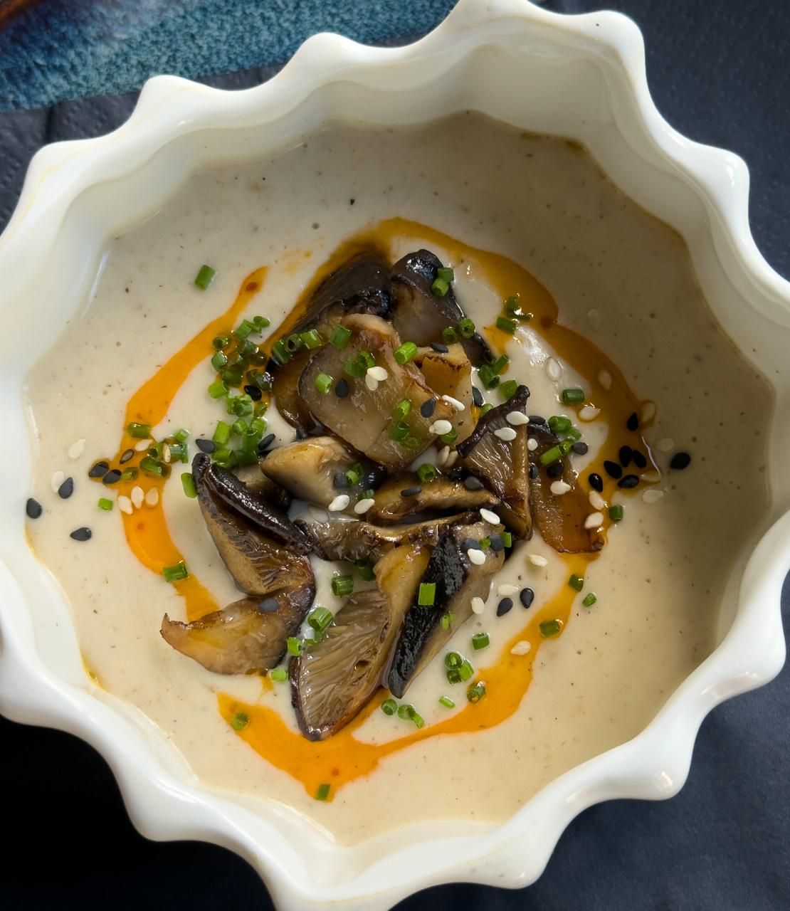 Arroz, tartar de salmón, algas wakame, sésamo, cebollino, kataifi crujiente, soja picante, mayonesa picante, miel, lima, anacardos